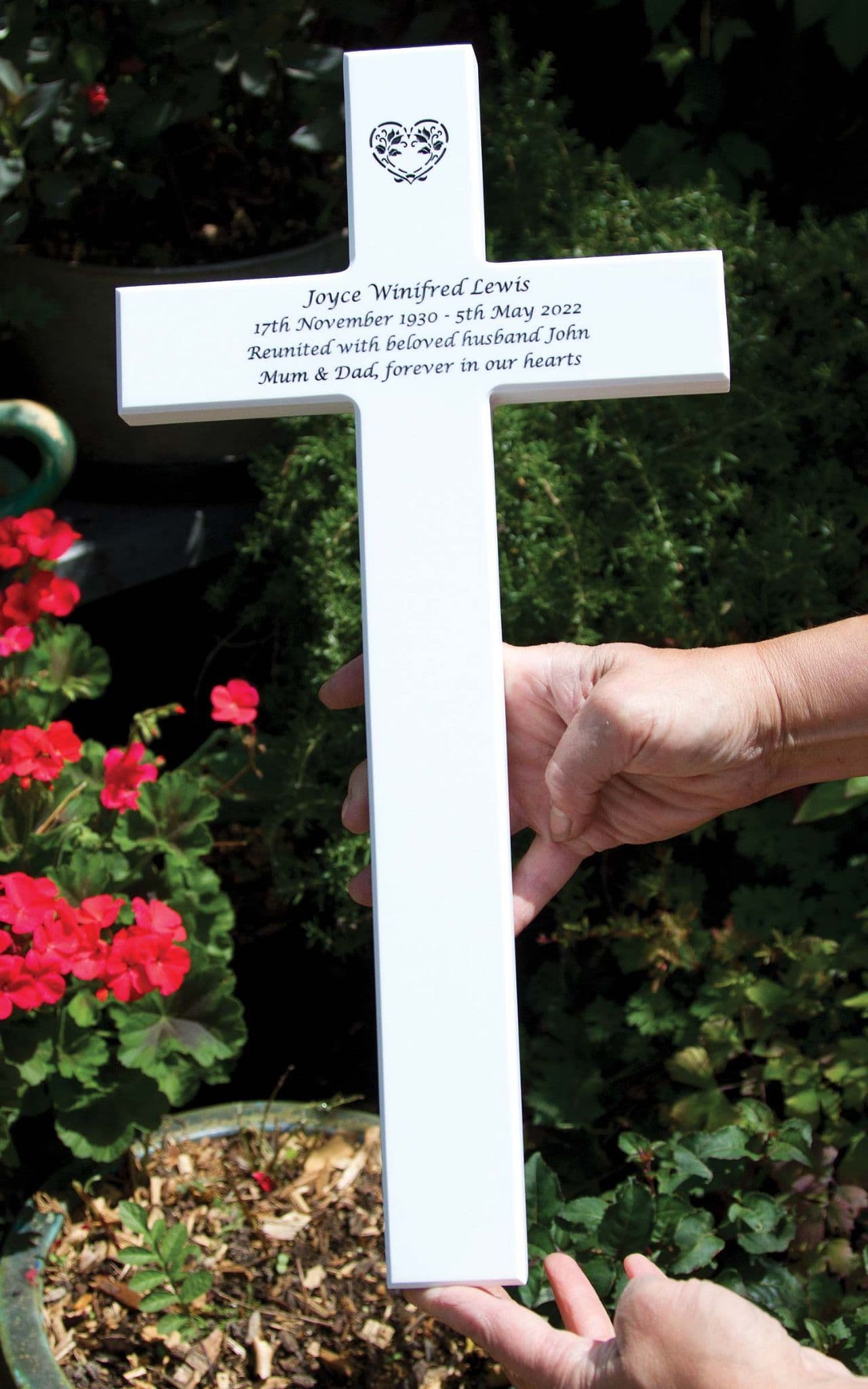 These memorial crosses are made from double thickness stone-like corian. Two pieces of the standard 12mm corian have been bonded together. Corian offers an advantage over wood due to its longer lifespan and minimal maintenance requirements. It comes in five standard colours. If you prefer a wooden cross which is cheaper - Click Here